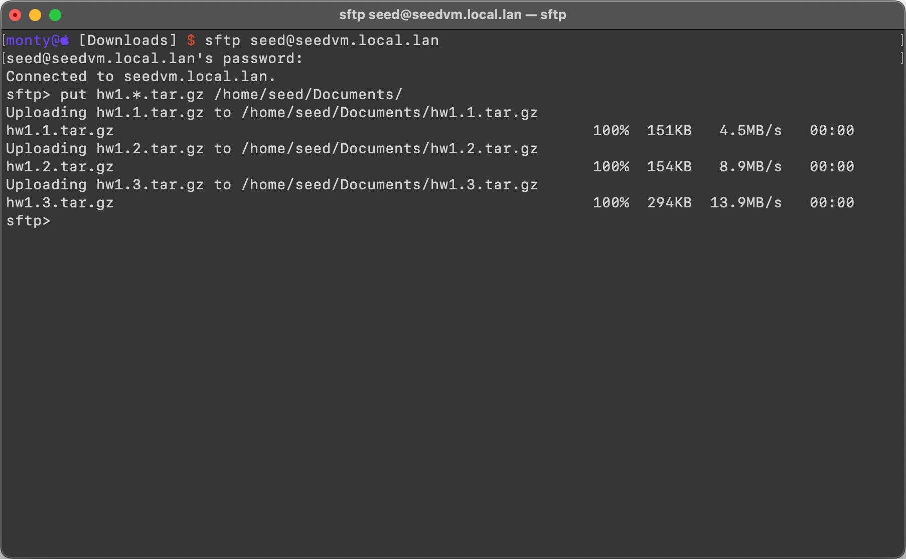 stfp> put hw1.*.tar.gz /home/seed/Documents/