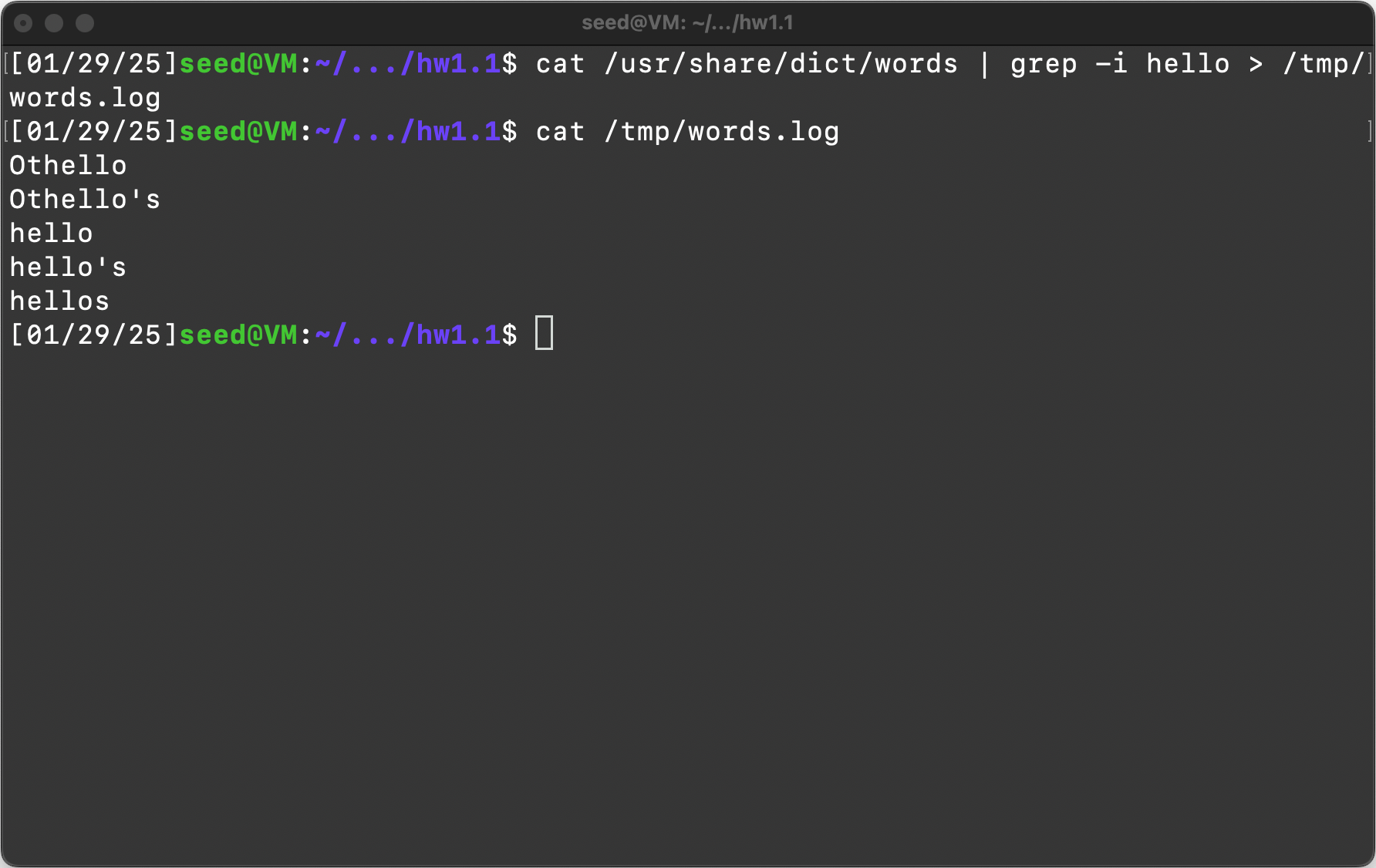 Item 2: Run the following command “cat /usr/share/dict/words | grep -i hello > /tmp/words.log”