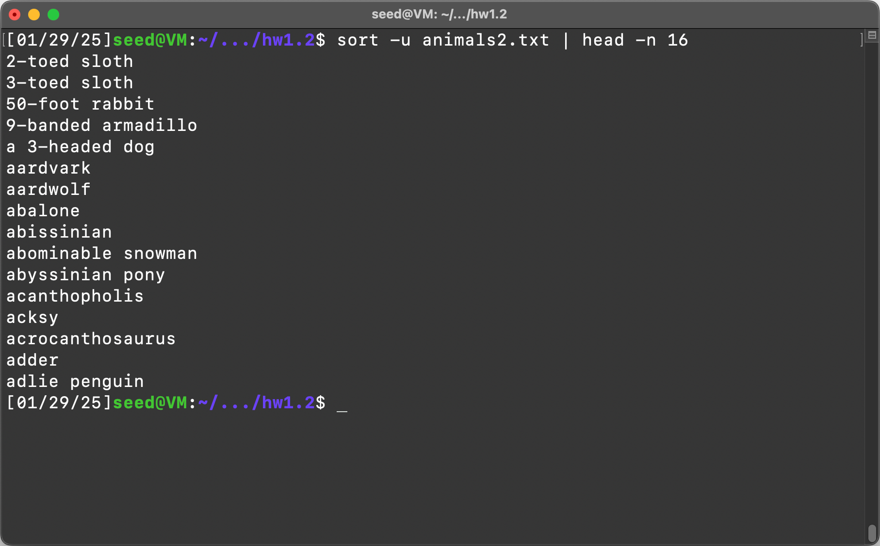sort command, -u for uniqname removes duplicates, animals2.txt is the file put in an argument, piped to head -n 16 to show the first 16 items out the output.