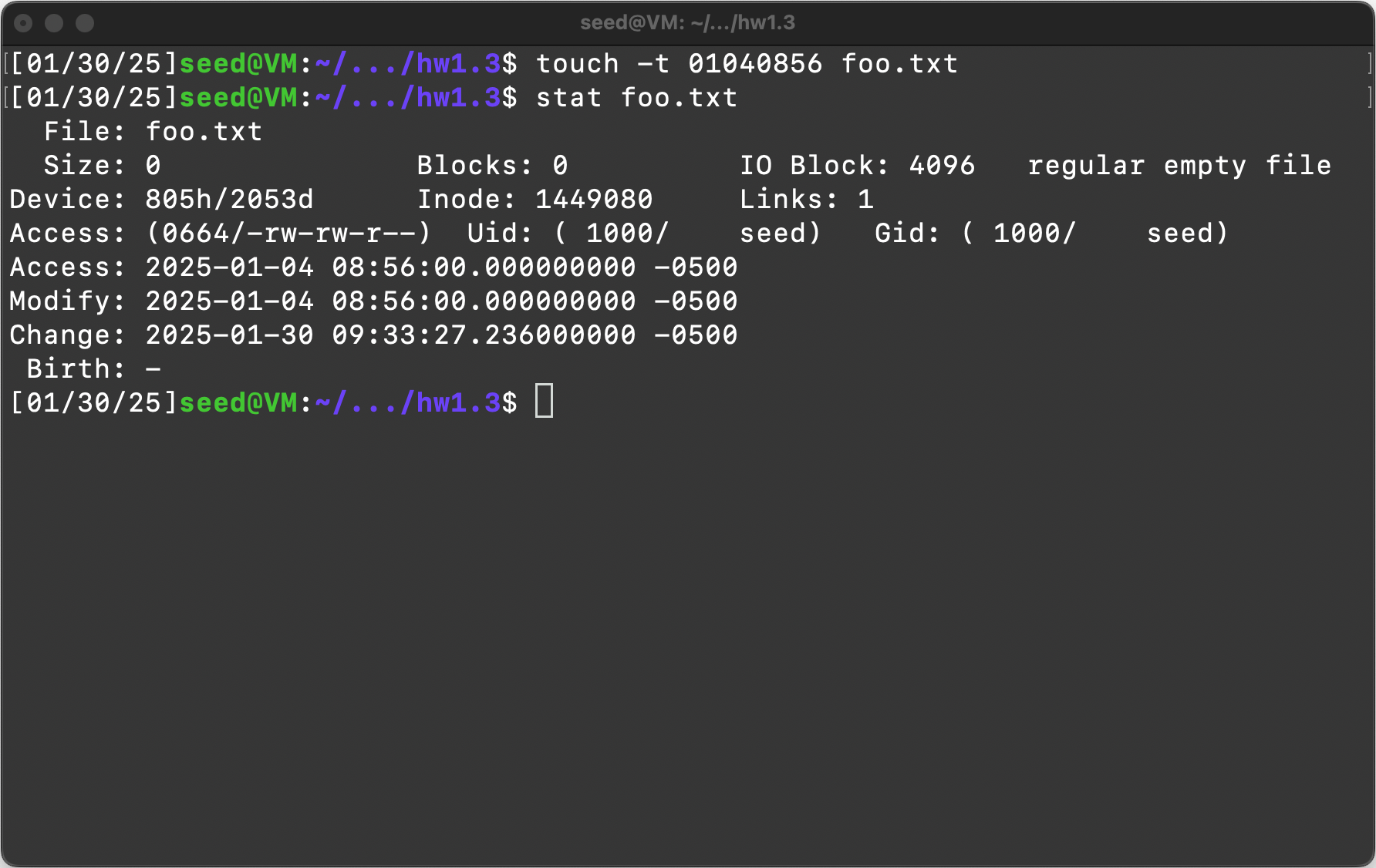 Item 4: Create a file foo.txt using the “touch” command. Change the file’s last-modified date to be January 4 of this year at 8:56am