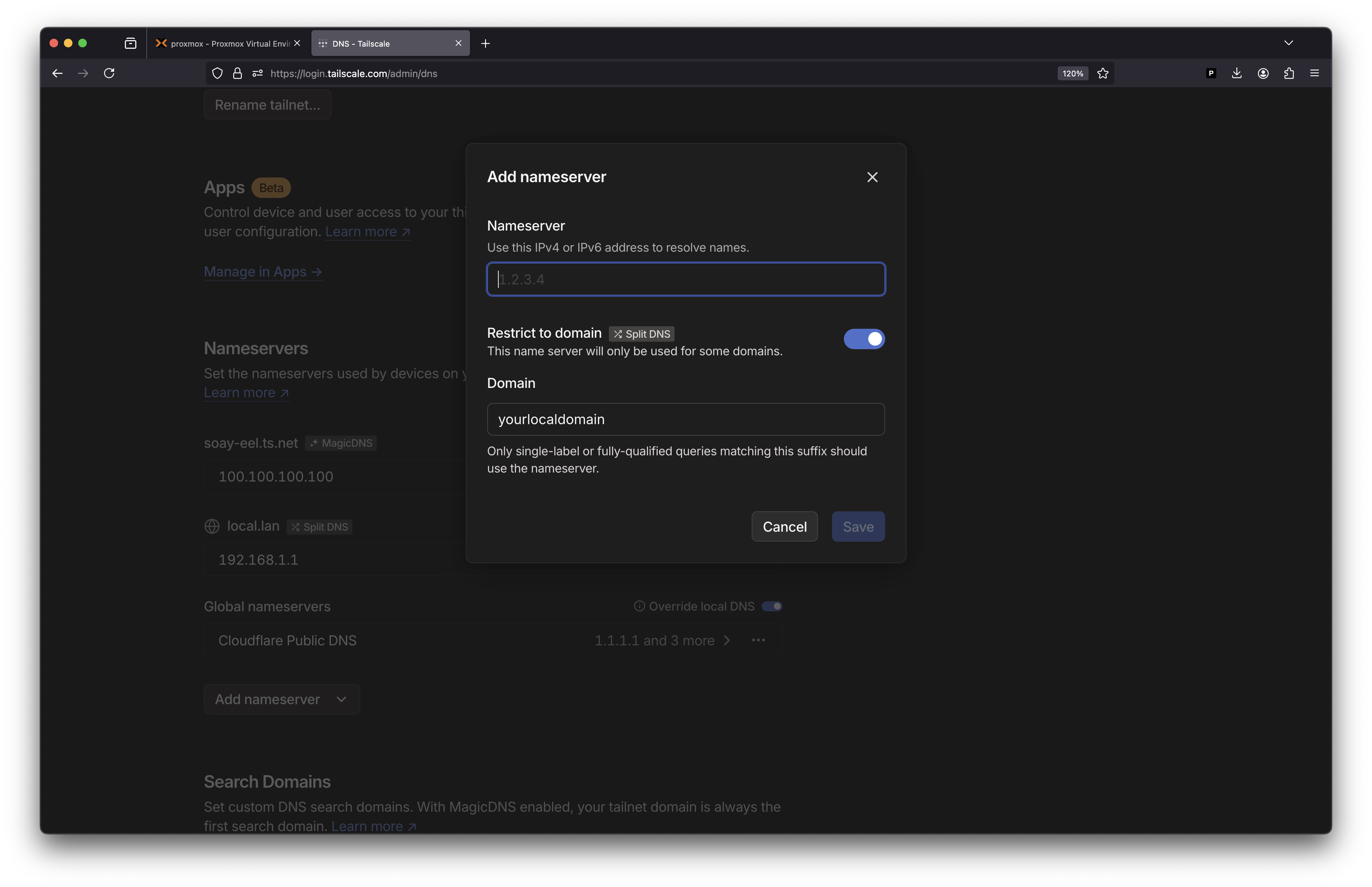 I want to connect to my Tailnet on my laptop, type in the address bar “http://proxmox.local.lan:8006” and get the web UI, as I do at home. Later I plan to do reverse proxy things to be able to leave out the port number.