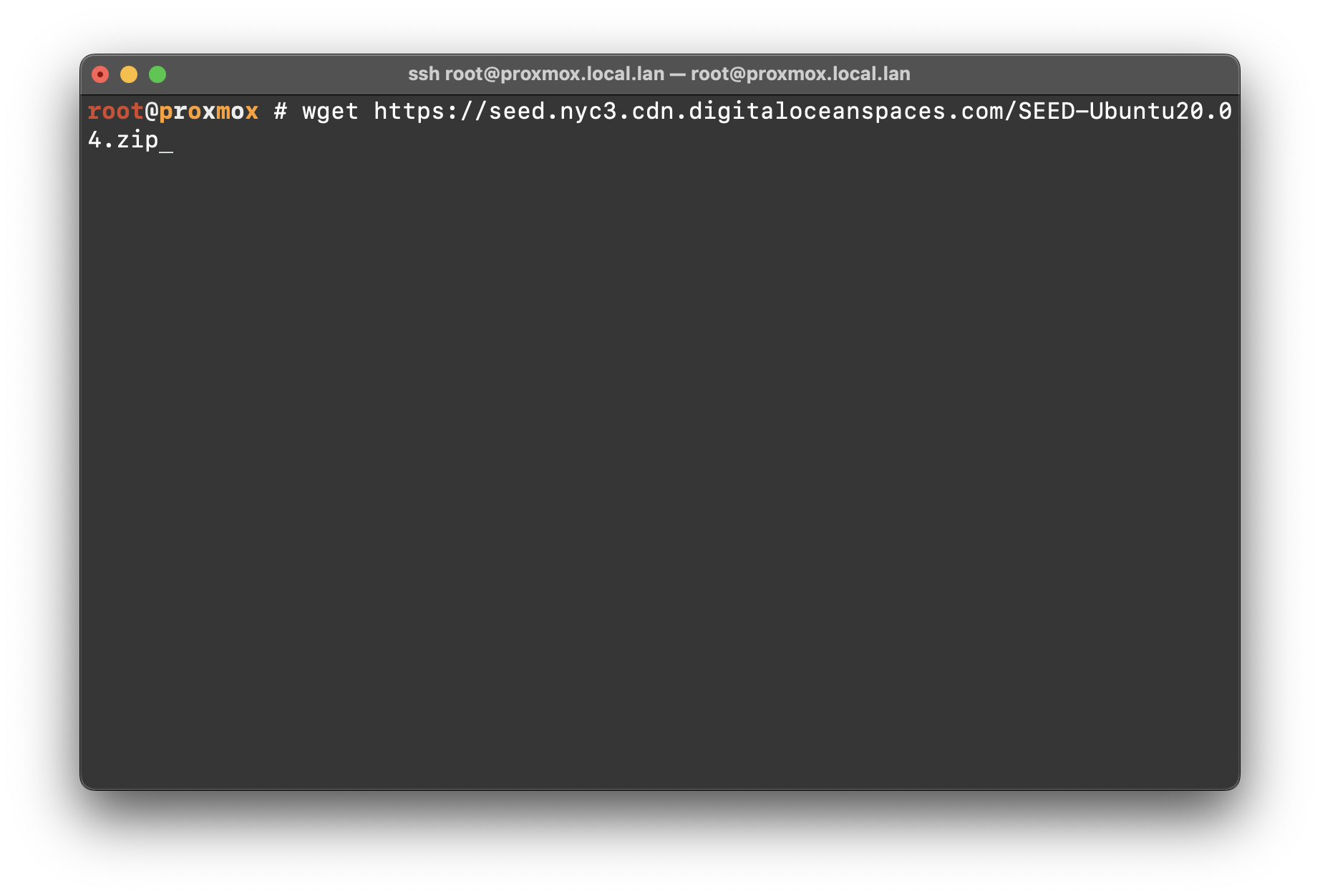 The first you need to do is get the VDI image on the Proxmox host. You can do this many ways but since my VDI is available from the SEED Lab website for download, I ssh’d into the Proxmox machine and downloaded the file with wget: